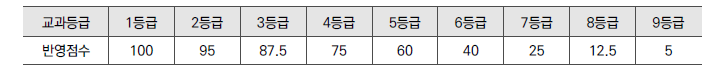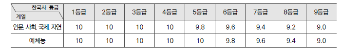 ※ 영어와 한국사는 등급에 대하여 다음의 등급별 점수 또는 등급별 가산점을 반영함