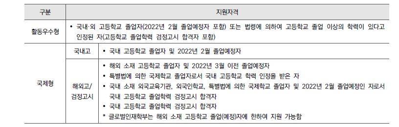 ∙ 국내 고등학교 졸업자 및 2022년 2월 국내 고등학교 졸업예정자로서 국제인재로서 성장잠재력을 보여 줄 수 있는 자