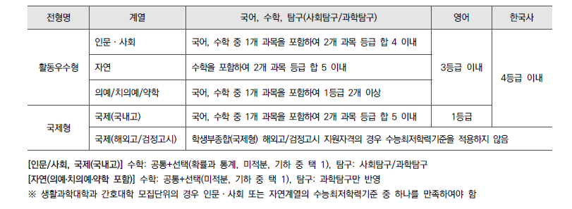 ④ 대학수학능력시험 최저학력기준 적용: 위 ①, ②를 충족하지 못하는 경우 대학수학능력시험에 응시하고 응시과목 중 상위 등급인 2개 과목의 평균 등급이 7 이내인 자