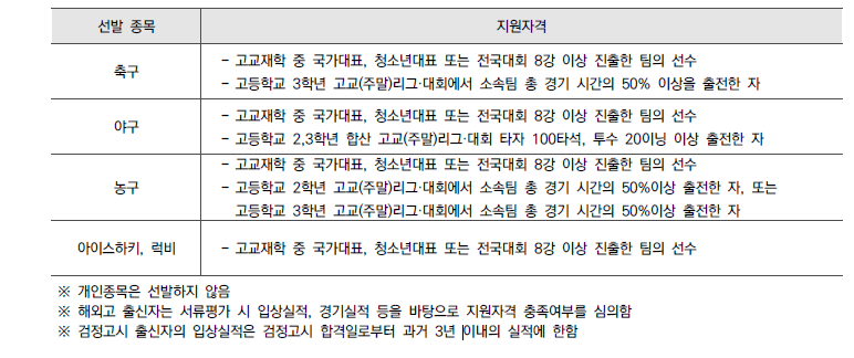 ∙ 단체종목(축구, 야구, 농구, 아이스하키, 럭비)만 선발하며, 종목별, 포지션별 선발 예정 인원은 수시모집 요강 발표 시 안내함