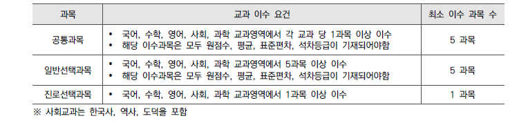 - 원점수, 평균, 표준편차가 제공되는 과목의 각 원점수가 각 해당 과목 평균의 50% 이상인 이수단위의 합이 모든 이수과목(원점수, 평균, 표준편차 제공)의 단위수 합의 25% 이상 - 교과등급 7등급 이내인 과목과 성취도 B이상(3단계 평가) 혹은 보통 이상인 과목과 성취도 D이상(5단계 평가)인 과목의 단위수 합이 해당 이수과목 단위수 합의 25% 이상
