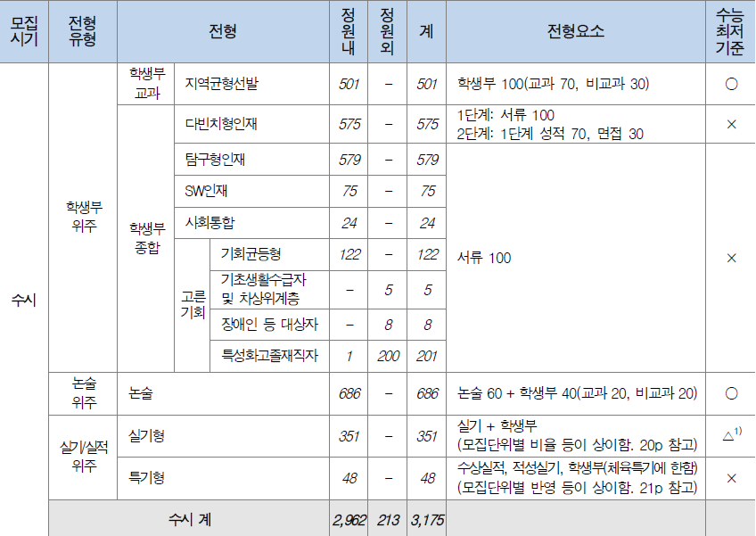 - 학생부, 자기소개서 등을 근거로 지원자의 학업 및 교내 다양한 활동을 통한 성장 가능성을 종합적으로 평가