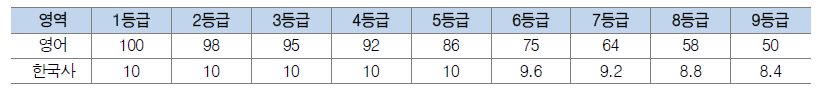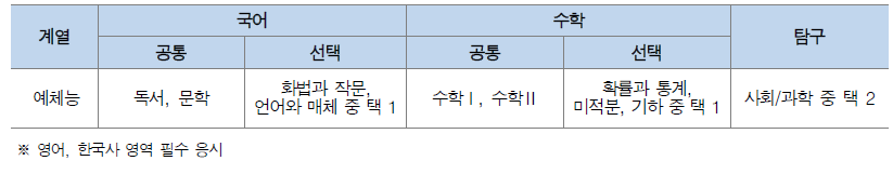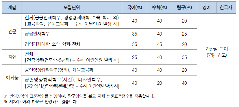 - 계열별 지정한 선택 과목을 응시하여야하며, 아래와 같이 영역별 반영 비율을 적용함