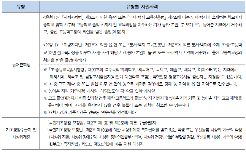 - 예술고, 체육고, 마이스터고, 방송통신고, 학력인정 평생교육시설, 특성화고 출신자(일반고의 특성화(전문계) 과정 이수자, 대안교육 특성화고등학교, 일반고등학교의 대안교육위탁학생 출신자 포함)