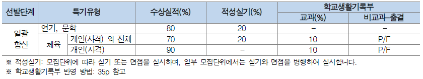 - 학교생활기록부를 근거로 지원자의 학업 및 교내 다양한 활동, 체육과목의 성취도, 체육활동의 다양성 및 우수성