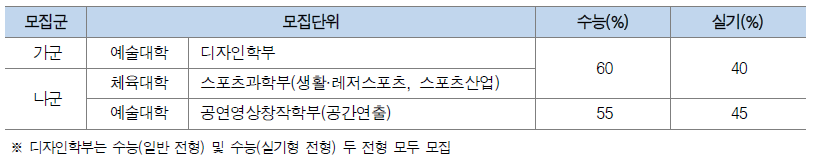 디자인학부는 수능(일반전형) 및 수능(실기형전형) 두 전형 모두 선발