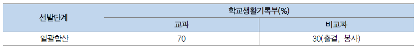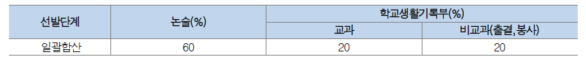 - 학교생활기록부, 자기소개서 등을 근거로 지원자의 학업능력, 사회경력, 자기계발 노력 등을 종합적으로 평가