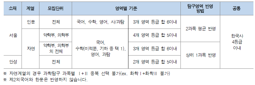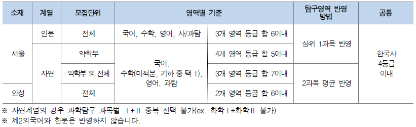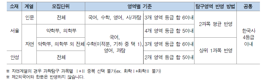 ※ 검정고시출신자, 외국고교졸업(예정)자, 학교생활기록부가 없거나 학교생활기록부만으로 석차등급을 산출할 수 없는 자는 지원할 수 없음.