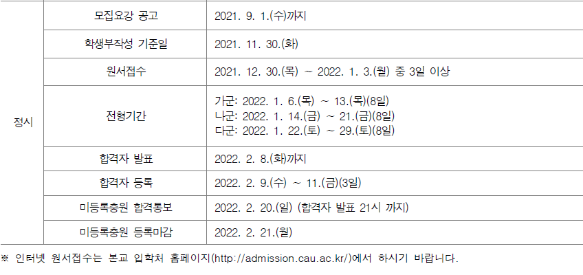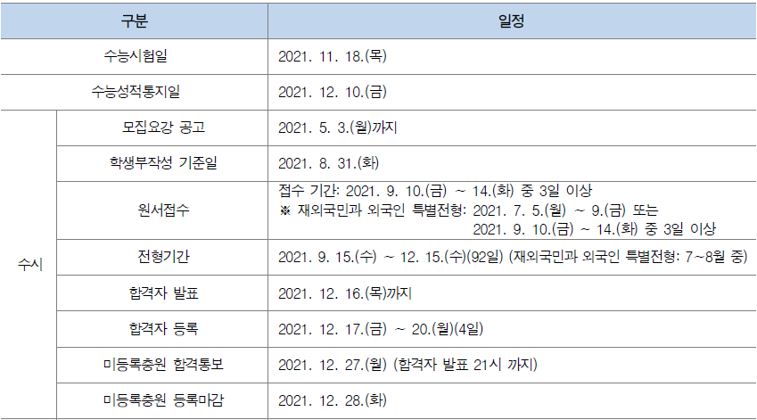 □ 본 일정은 한국대학교육협의회의 ‘2022학년도 대학입학전형 기본사항’ 기준이며, 아래 일정을 참고하여 본교의 전형 일정이 확정됩니다. 확정된 일정은 추후 모집요강에 공지합니다.