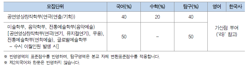 - ‘나)’에서 지정한 선택 과목을 응시하여야하며, 아래와 같이 영역별 반영 비율을 적용함