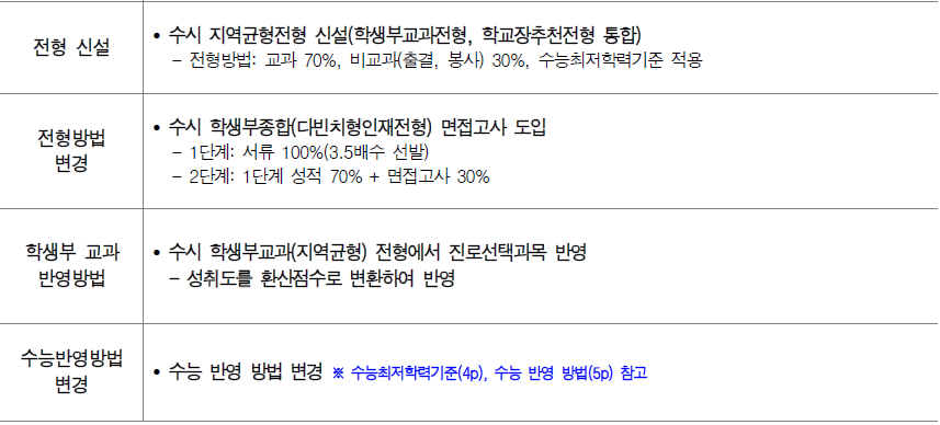 - 학교생활기록부, 자기소개서 등을 근거로 지원자의 학업 및 교내 다양한 활동을 통한 성장 가능성을 종합적으로 평가