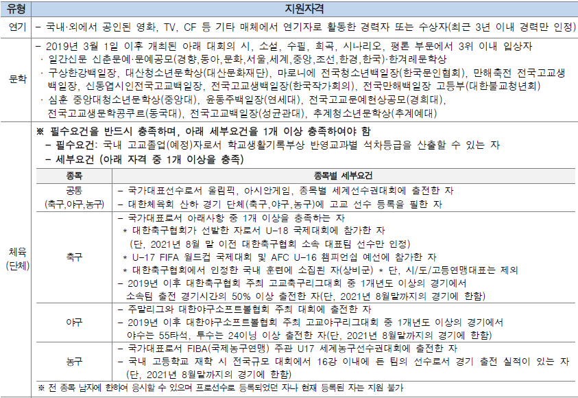 ※ 체육특기의 경우 필수요건을 반드시 충족함과 동시에, 자격요건을 1개 이상 충족해야 함