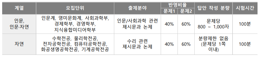 ⦁ 논술시험 적용 교육과정 및 대상교과 : 2015 개정 교육과정의 보통교과(공통과목+선택과목), 전문교과 제외