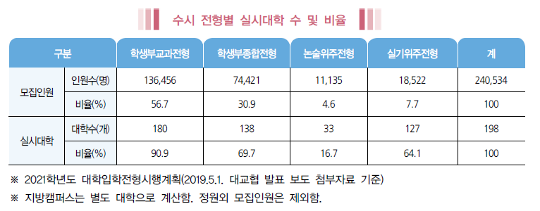 ⑵ 고른기회전형이나 농어촌전형 등의 특별전형을 제외하고 일반전형만을 대상으로 전형별 모집인원을 비교해 보면, 전체 모집인원 240,534명 중 학생부교과전형으로 모집하는 인원은 136,456명으로 전체의 56.7%를 차지한다.