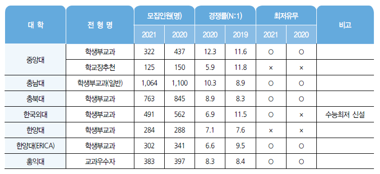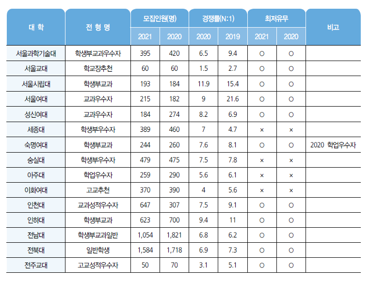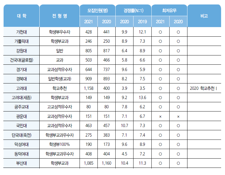 [2021학년도 대학별 학생부교과전형 모집인원 및 수능최저학력기준 설정 유무 비교]