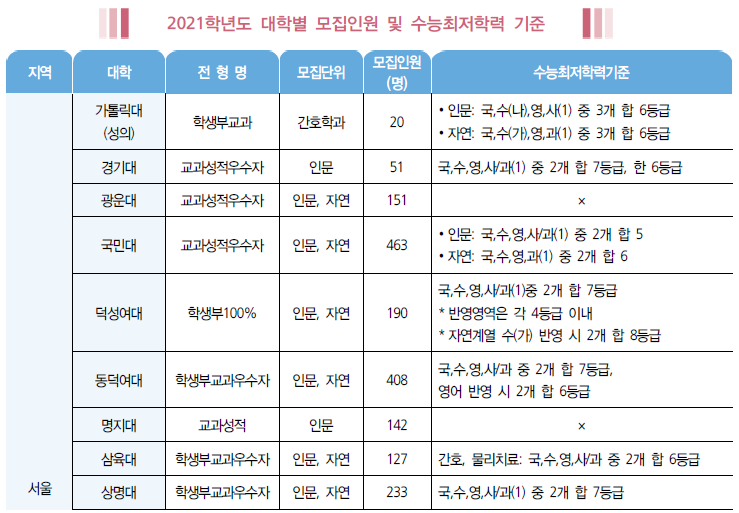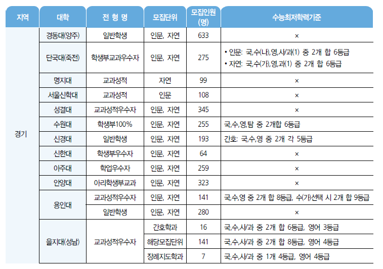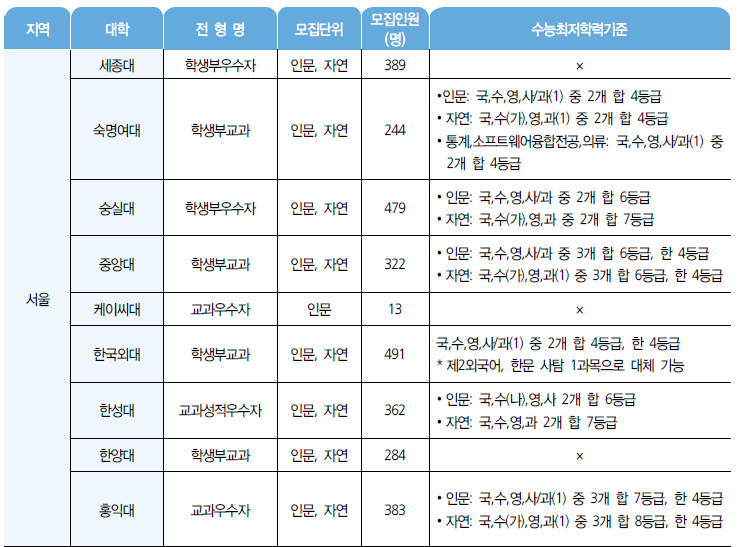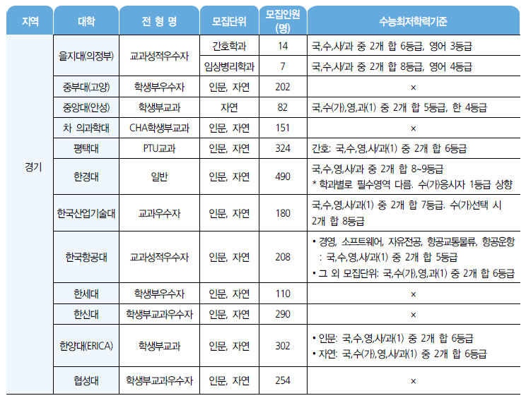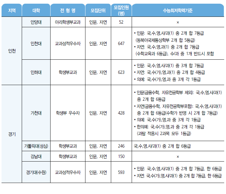 ∙ 학생부 100%로만 선발하는 전형의 경우 대부분 수능최저학력기준을 적용하여 선발하고 있으며, 수능최저학력기준이 높은 일부 대학은 수능최저학력기준 충족 여부가 합격과 높은 상관관계를 갖기도 한다. 수능최저학력기준을 적용하지 않고, 면접고사도 실시하지 않는 학생부교과전형의 경우, 교과 성적의 합격선이 매우 높게 형성된다.