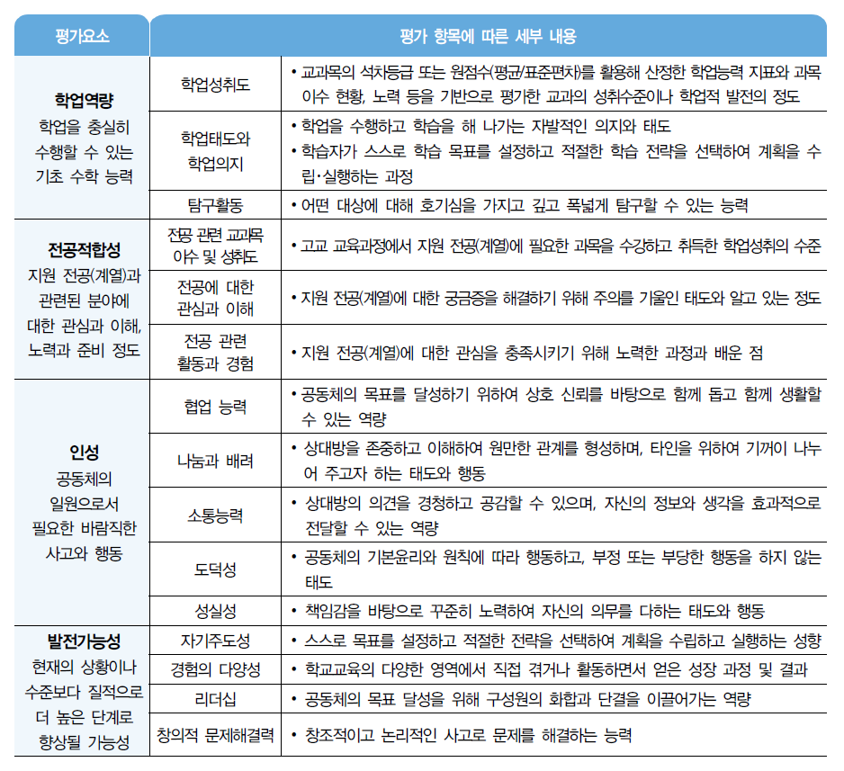 서울 주요 6개대학 학생부종합전형 서류평가요소