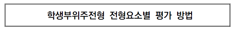 - 입학사정관 2인이 종합적으로 정성평가하고, 평가위원 간 일정 점수 이상의 점수 차이가 나는 경우 평가조정위원회를 개최하여 조정점수를 부여함