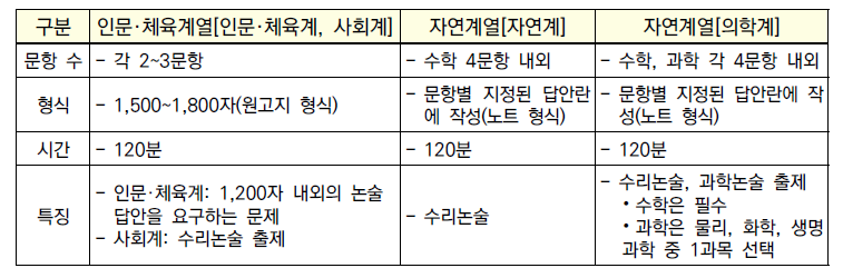 - 통합교과형 논술로 수험생의 통합적이고 다면적인 사고 및 표현 능력 측정
