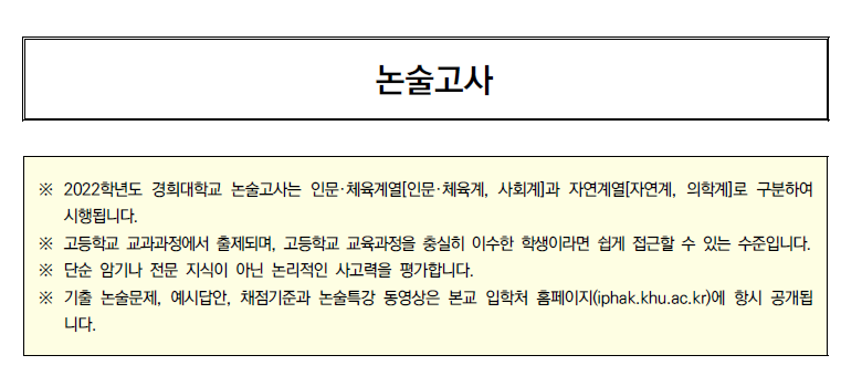 - 의학계 논술고사의 경우, 수학은 필수이고 과학은 물리, 화학, 생명과학 중 한 과목 선택 (물리, 화학, 생명과학 과목은 고등학교 교육과정의 물리Ⅰ·Ⅱ, 화학Ⅰ·Ⅱ, 생명과학Ⅰ· Ⅱ 범위 안에서 출제)