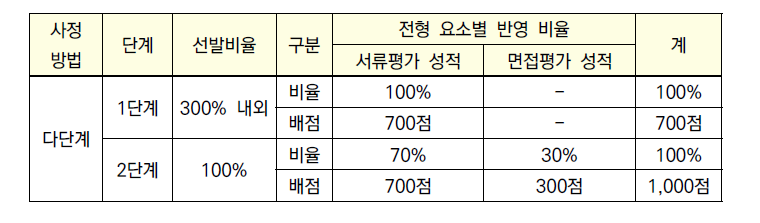1단계는 서류평가 성적으로 모집인원의 3배수 내외를 선발하며, 2단계는 1단계 성적과 면접평가 성적을 합산하여 총점 순으로 선발합니다.