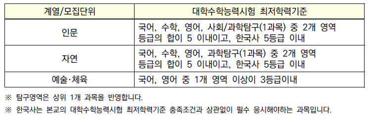 인문·사회계열은 국어, 수학, 영어, 사회/과학탐구 2과목, 한국사, 자연계열은 국어, 수학(미적분 또는 기하), 영어, 과학탐구 2과목, 한국사, 예술·체육계열은 국어, 영어, 사회/과학탐구(1과목 이상) 응시자만이 지원 가능합니다.