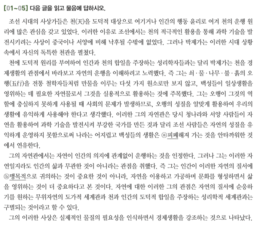 EBS 교재 『수능완성 - 국어』 69~71쪽 1~5번 세트의 지문과 문항