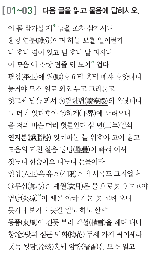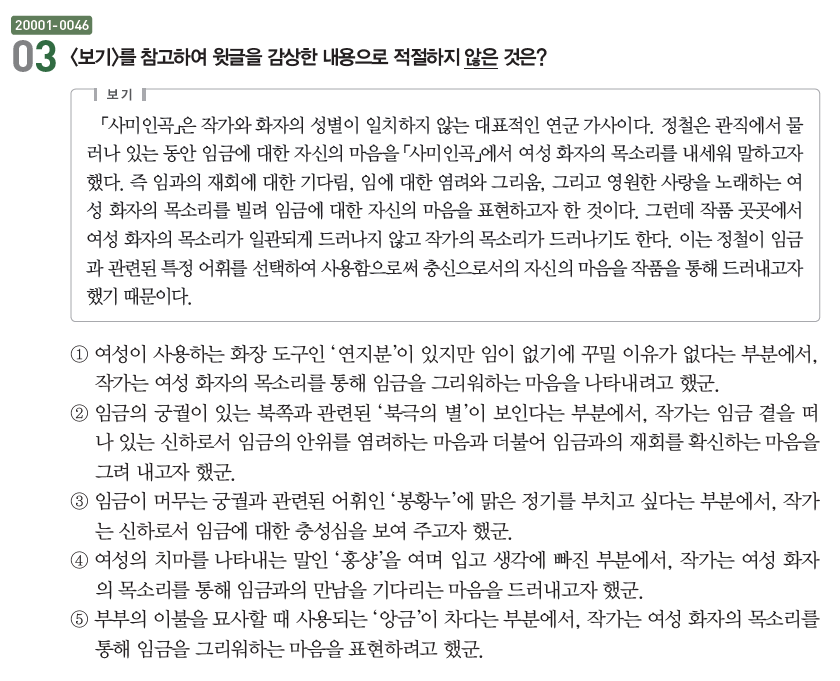 45번) 등 현대와 고전의 다양한 갈래의 작품들을 활용하여 출제하였다.
