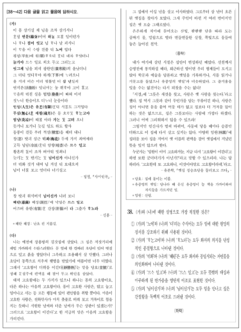 【예시 문항 2】 국어 38~42번 세트의 지문과 문항