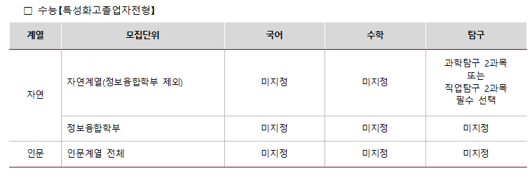 □ 각 모집단위별 수능 반영영역과 수험생이 응시한 수능 영역이 서로 다른 경우 또는 반영영역 중 1개 영역이라도 응시하지 않은 경우 불합격 처리함(단, 스포츠융합과학과는 수학영역 미응시자도 지원 가능)
