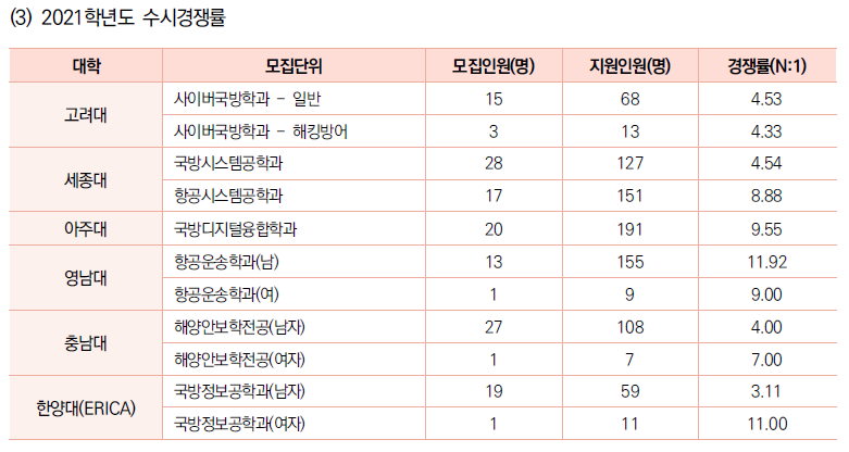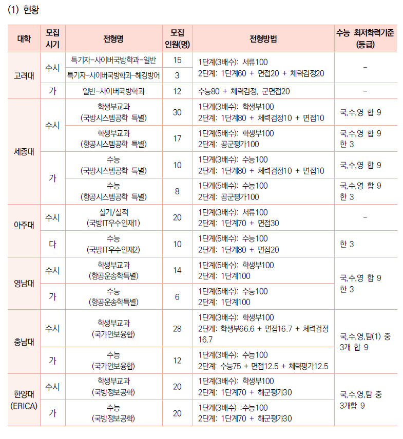 ∙군의무복무형 계약학과는 전문적 지식과 덕성을 겸비한 육・해・공군의 기술 장교 육성을 목표로 한다. 합격생 전원에게 대학 졸업 시까지 등록금 전액을 국군에서 지급한다. 학부 4년에 졸업 후 의무복무 3년을 더해서 총 7년간의 의무복무를 해야 한다. 전형방법 중 체력검정과 군면접을 실시한다.