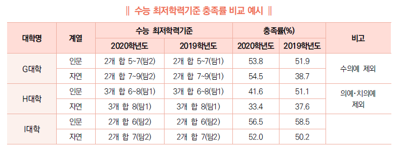 (4) 학생부위주(교과)전형에는 수능 최저학력기준을 적용하는 대학들이 많다. 학생부위주(교과)전형에서 수능최저학력기준을 요구하는 대학의 경우 해마다 변화하는 수능 난이도와 경쟁률, 지원자 등에 따라 달라지겠지만, 수능 최저학력기준 충족률이 의외로 낮은 편이다. 대학 발표 자료를 기준으로 G대학, H대학, I대학의 결과를 비교해 보면 수능 최저학력기준 충족률이 대체로 40%~60% 정도이다.