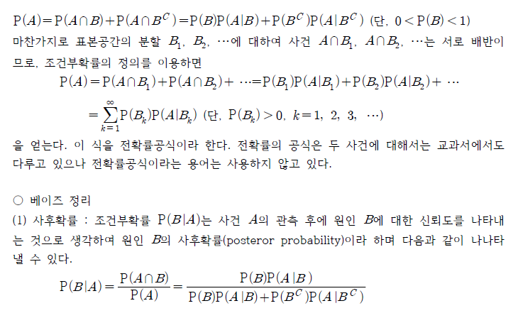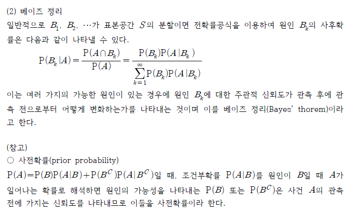 조건부확률은 베이즈(Bayes) 정리의 가장 단순한 형태인데, 베이즈 이전에 많은 수학자들이 조건부확률의 상황에 대해 알고 있었으며 그 내용에 대한 언급과 저술도 있었으나 이를 최초로 형식화한 수학자가 베이즈로 알려져 있다. 베이즈 정리를 알기 전에 몇 가지 사전 지식을알아보자.