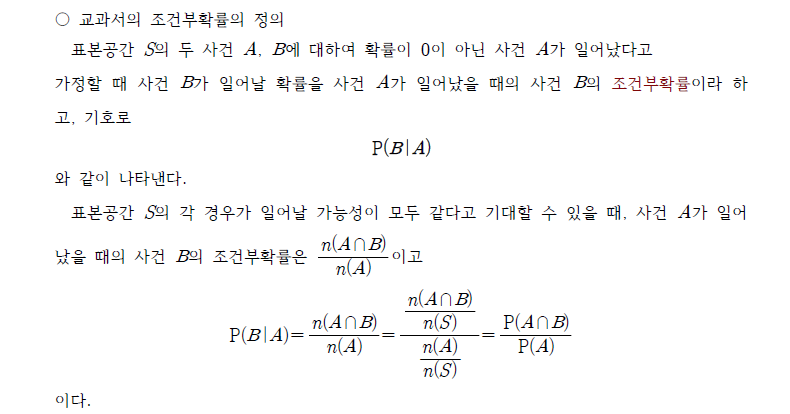 확률의 곱셈정리를 배우면서 익히게 되는 조건부확률은 확률 단원에서 가장 대표적인 유형으로서 의미도 있지만 논리적 추론의 관점에서 가정이 참인 상황에서 결과가 나타날 가능성을 예측한다는 의미와 어떤 결과가 일어난다고 가정하였을 때 어떤 가정이 참이 될 가능성을 추론하는 과정을 의미한다는 것이다.