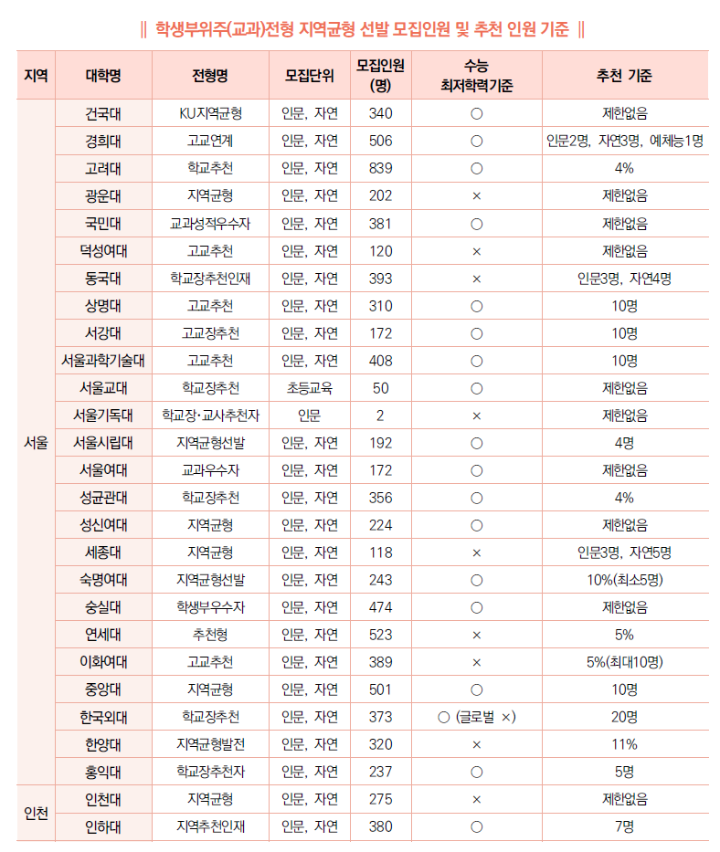 (3) 또한, 41개 대학 중 58.5%에 해당하는 24개교가 수능 최저학력기준을 적용하고 있으며, 56.1%인 23개교에서 추천 인원을 제한하여 선발할 계획이다. 학교장 추천 전형의 추천 인원 기준은 대학에 따라 다양한데, 일정 인원을 추천하는 경우와 재적인원의 일정 비율을 추천기준으로 적용하는 예도 있다. 추천 인원을 제한하는 대학의 경우, 일선 고등학교에서는 추천의 형평성을 고려하여 대체로 복수 추천보다는 단수 추천을 선호함을 고려할 때 합격자의 교과 등급이 예측보다 내려갈 수도 있을 것으로 예상된다. 따라서 수능최저학력기준 충족과 일정 수준의 교과 성적 유지를 통해 학생부위주(교과)전형 지역균형 선발을 목표로하는 것도 또 다른 전략이 될 수 있다.
