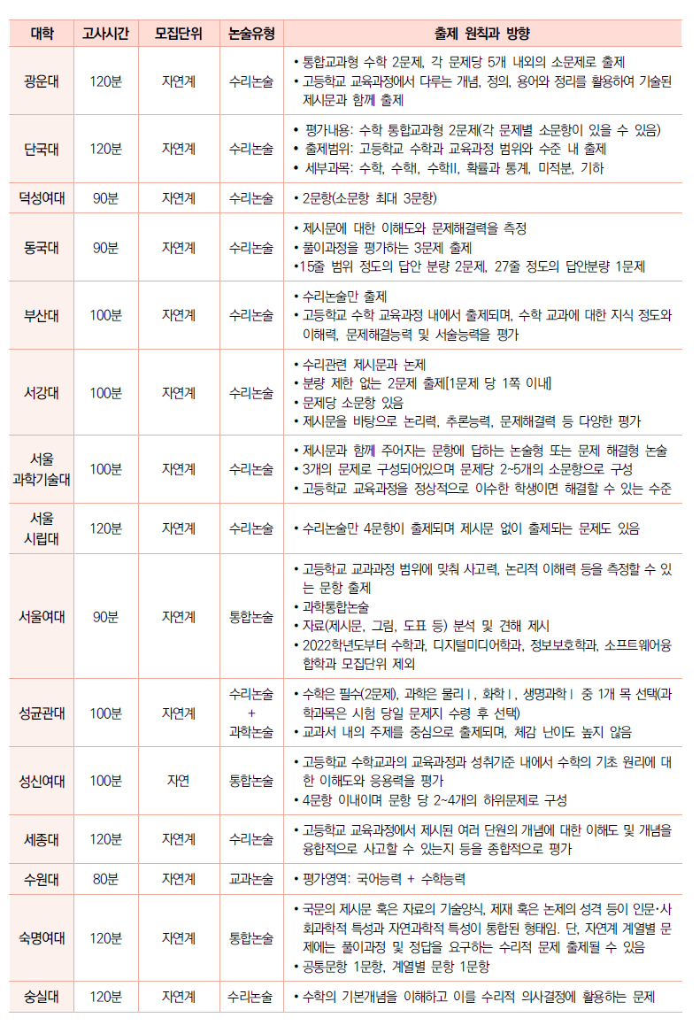 ∙ 통합논술을 실시하는 대학은 숙명여대, 서울여대 등이 있다. 숙명여대는 인문・자연 공통문항 1문항과 자연계열 문항 1개로 구성되어 있다. 서울여대는 과학 통합논술이다. 통합논술을 실시하는 대학을 지원하는 경우는 별도의 출제 경향과 기출문제를 확인하여 대비하여야 한다.