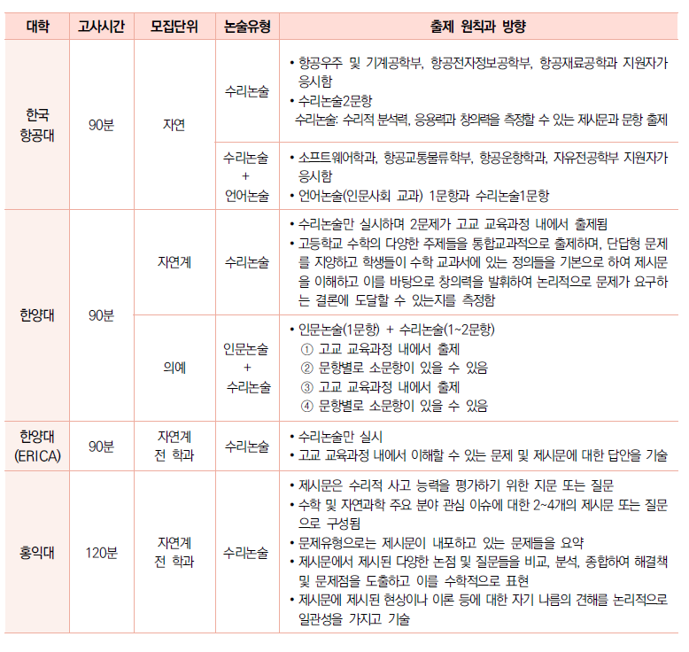∙ 언어논술과 수리논술의 통합논술을 실시하는 대학은 한국항공대(소프트웨어학과, 항공교통물류학부, 항공운항학과, 자유전공학부)와 가톨릭대 생활과학부, 미디어기술콘텐츠학과이다. 한양대 의대도 언어논술+수리논술을 실시한다.