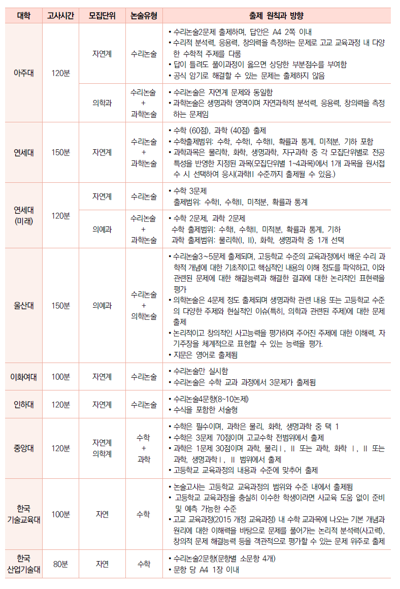 ∙ 의학계열 중 울산대 의대는 수리논술+의학논술을 아주대 의대는 수리논술+생명과학 논술을 실시한다.