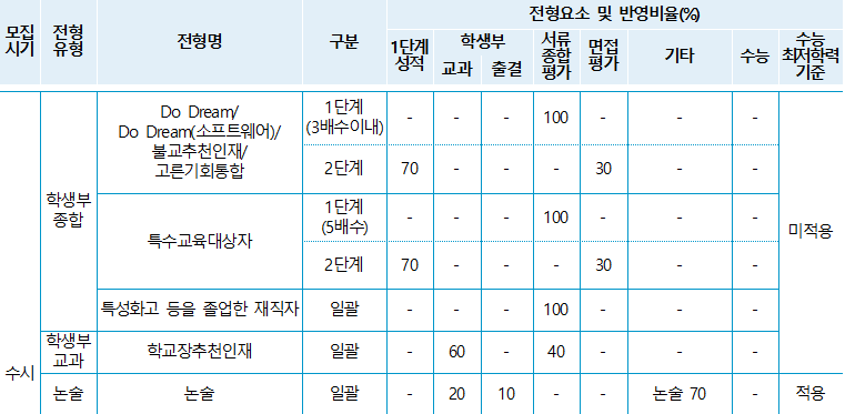 동국대학교 2022학년도 전형유형별 전형요소 및 반영비율