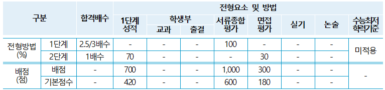 1) 평가방법 : 2인의 입학사정관이 제출서류를 바탕으로 10분 내외의 개별면접