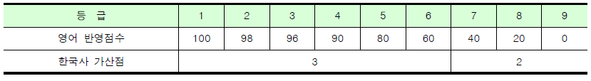 ▶ 영어 및 한국사 영역의 등급별 반영점수 및 가산점