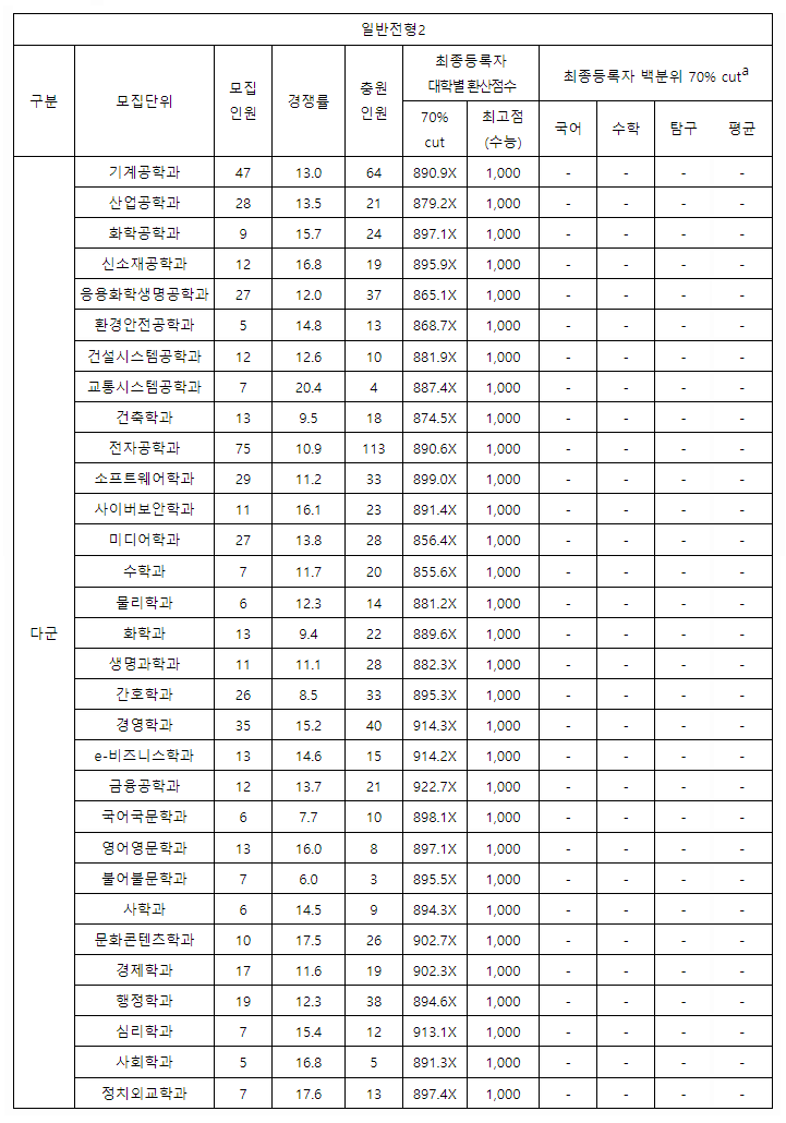 아주대학교 2021학년도 정시 대학별 환산점수 70%컷