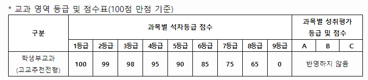 - 교과 영역 등급 및 점수표