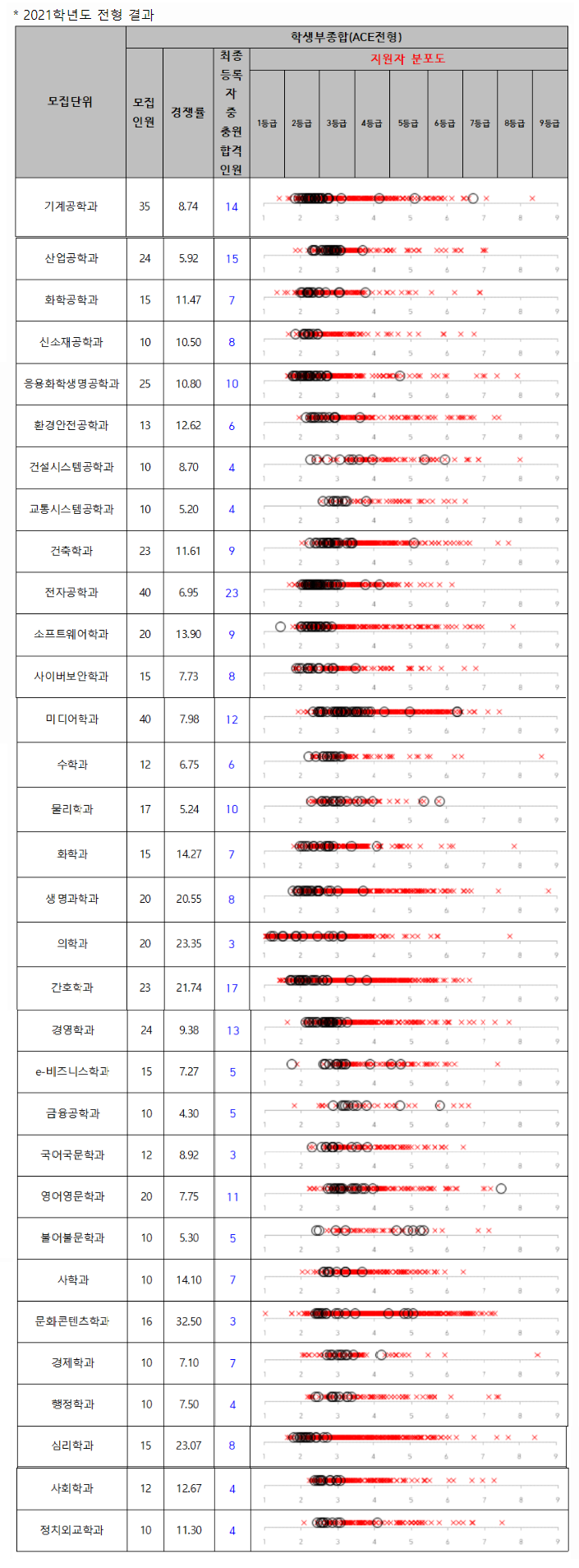 아주대학교 2021학년도 학생부종합(ACE전형) 지원자 등급 분포도
