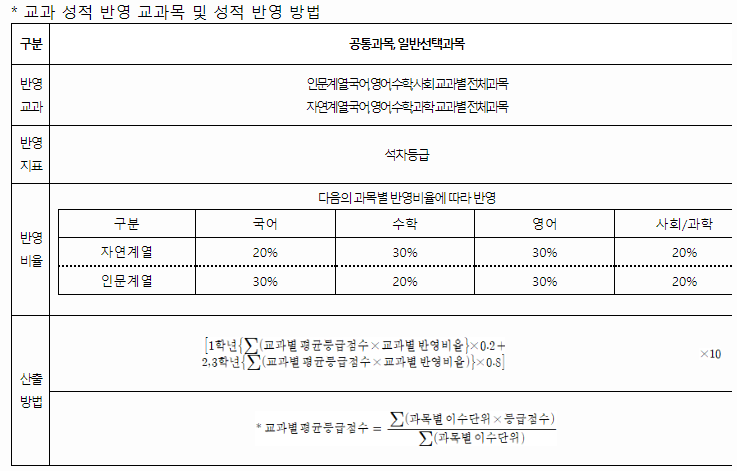 - 교과 성적 반영 교과목 및 성적 반영방법