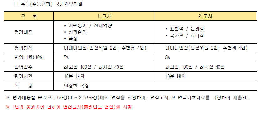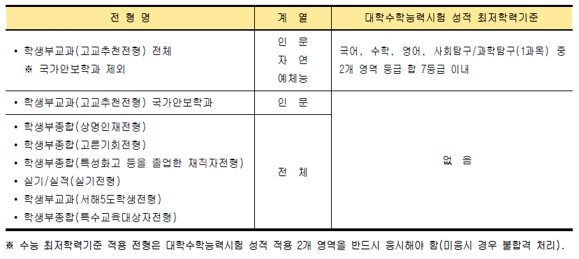 1) 전체(국가안보학과 제외) : 국어, 수학, 영어, 사회탐구/과학탐구(탐구영역 1개 과목 반영) 중 2개 영역 등급 합 7등급 이내