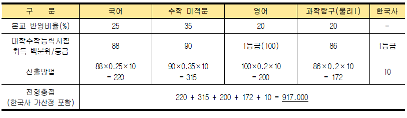 1) 국어, 수학, 탐구 영역은 백분위를 반영함.