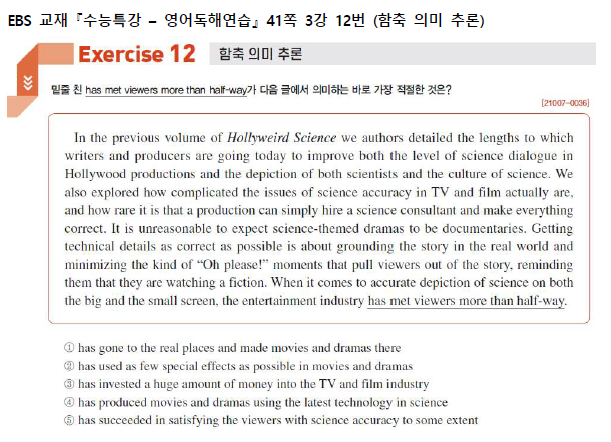 연계 문항은 모두 EBS 문항의 지문과 주제 소재 요지가 유사한 다른 지문 등을 활용하여 연계하였다. ((예시 문항 1,2,3,4)참조). EBS 연계 비율은 50%이상을 유지하였다 영어 영역에서 연계하여 출제된 문항을 EBS연계 교재 문항과 비교하여 제시하면 다음과 같다.
