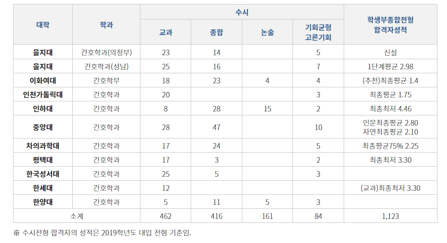 따라서 학생부종합전형에서는 간호학과 지원을 위해 진로탐색을 하고 충실하게 준비한 학생이라면 교과 성적이 다소 낮더라도 학생부종합전형에 지원할 수 있다.