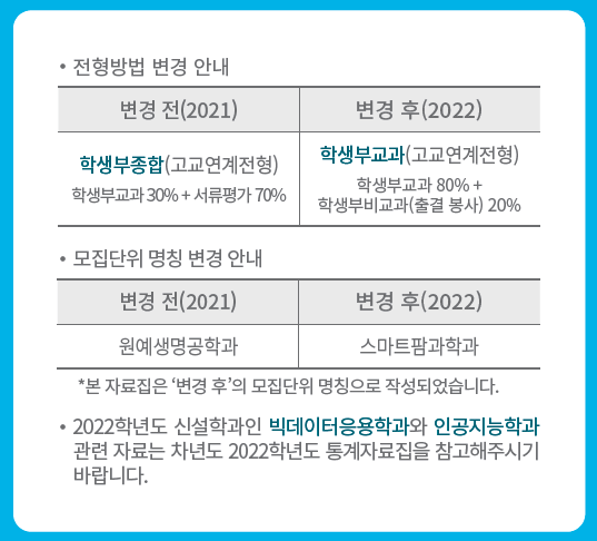 - 1단계는 자기소개서, 학교생활기록부를 토대로 서류 종합평가하며 서류평가 성적 100%로 4배수 선발, 2단계는 수능 최저학력기준을 충족한 자 중에서 1단계 성적 70%와 면접 30ㅆ를 합산하여 총점 순으로 선발